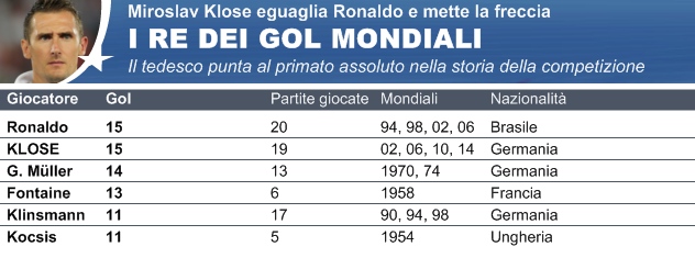 133. Dopo una stagione opaca nella Lazio, in molti pensavano che Miroslav Klose sarebbe stato un’alternativa di lusso per la Germania del “falso nueve” Muller. Invece il centravanti di origini polacche si è imposto da titolare, con la sua presenza come riferimento in avanti capace di far girare tutta la squadra. E’ arrivato anche il record di gol nei Mondiali, una storia fantastica se ci si pensa. Nel 2002, l’ultima finale giocata e persa dalla Germania, Klose era in campo. Quella partita fu vinta dal Brasile con doppietta di Ronaldo, lanciato a sua volta verso il sorpasso a Gerd Muller. Nel 2014, Klose si prende il primato come marcatore di tutti i tempi del Mondiale segnando il gol del sorpasso in semifinale al Brasile sotto gli occhi di Ronaldo… e in finale, conquista anche la Coppa, chiudendo un cerchio lungo dodici anni.